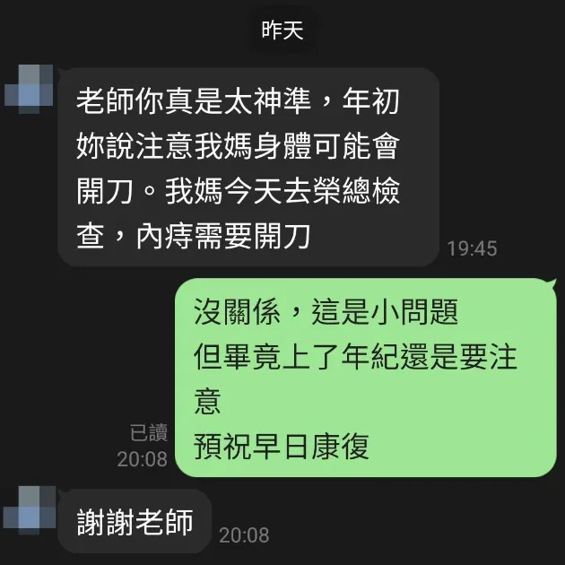 媽媽突發腎痛住院,驗證老師年初預言老師曾預言其母今年恐有手術機會,近日果真發生腎臟劇痛並緊急住院的情況。護理人員懷疑可能需動手術,並已拍攝影像發現兩顆異物,需等待進一步檢查確認是否為結石。卜卦指點 -
